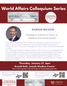 Join us for a talk on democracy and democratic renewal around the world. Our guest is Damon Wilson, President and CEO of the National Endowment for Democracy, a private, non-profit, non-partisan foundation dedicated to the growth and strengthening of democracy throughout the world. This talk is a co-sponsored by the World Affairs Council of Charleston and the Mroz Global Leadership Institute. It’s open to members of the World Affairs Council of Charleston, CofC faculty, staff, and students.